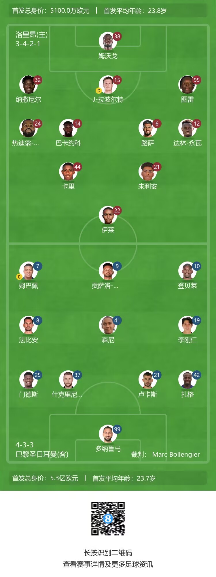 巴黎首發:99-多納魯馬、42-扎格、21-盧卡斯-埃爾南德斯、37-什克里尼亞爾、25-努諾-門德斯、8-法比安、19-李剛仁、41-馬尤盧、10-登貝勒、7-姆巴佩、9-貢薩洛-拉莫斯